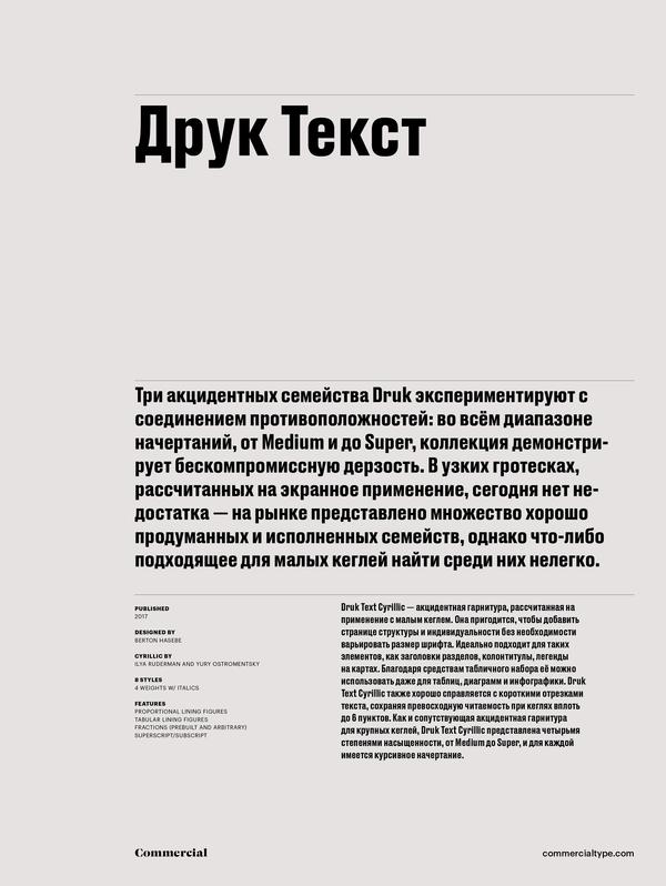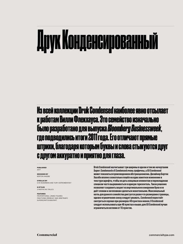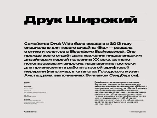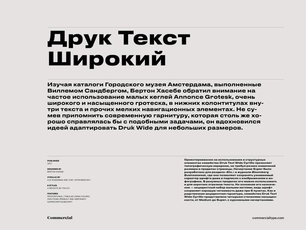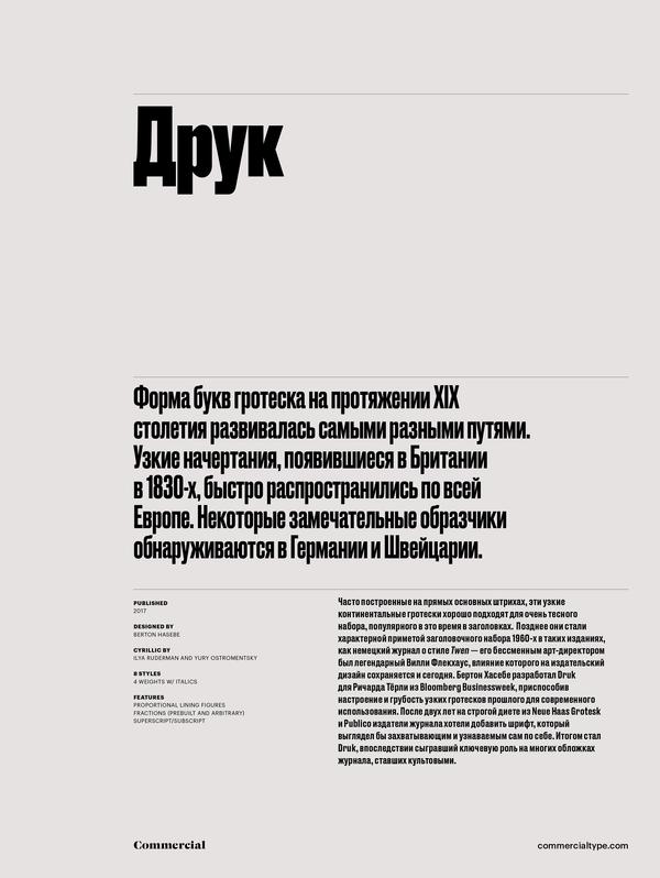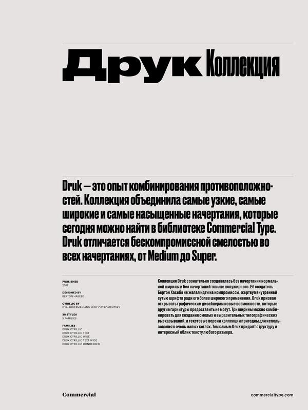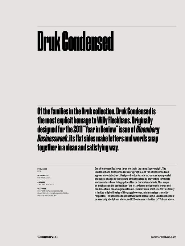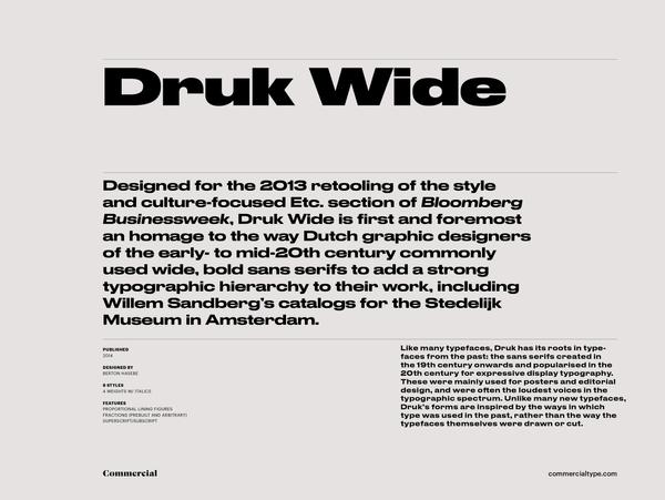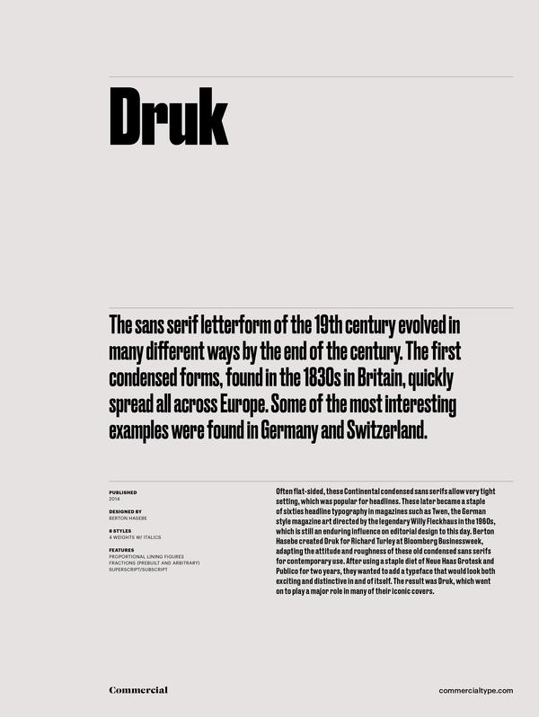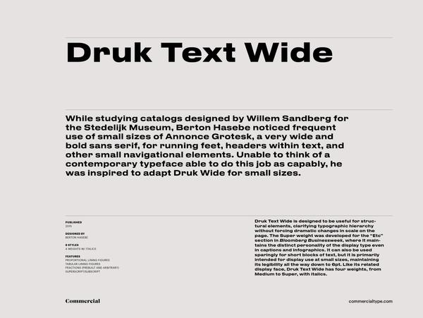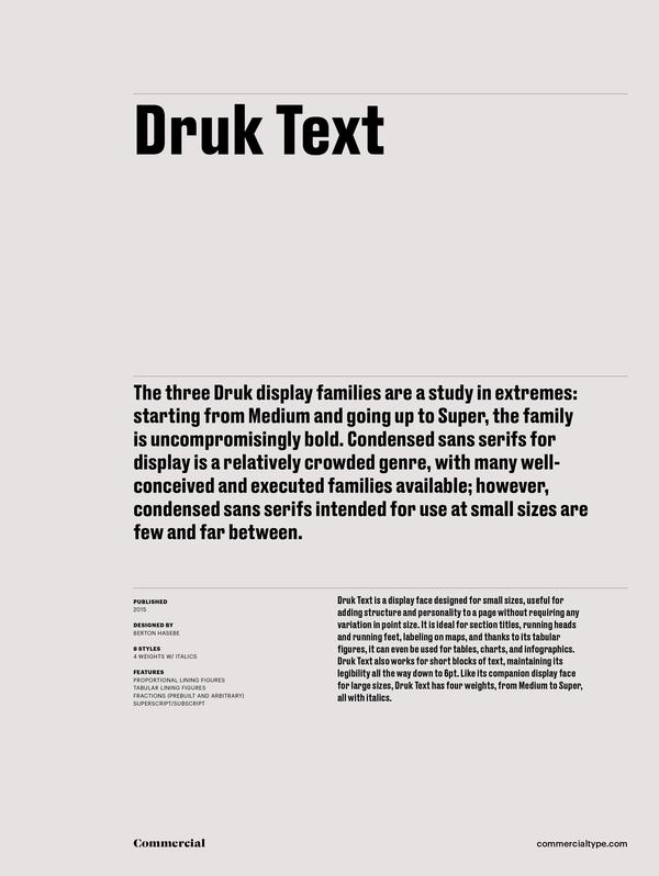 Druk is a study in extremes, featuring the narrowest, widest, and heaviest typefaces in the Commercial Type library to date. Starting from Medium and going up to Super, Druk is uncompromisingly bold. It was intentionally designed without a normal width, and without lighter-than-medium weights. Berton Hasebe, the designer, wanted to avoid shifting the focus of the typeface away from its most emphatic styles to accommodate more general-purpose usage. Druk is conceived to offer new possibilities to graphic designers that other typefaces can’t. Its initial use as a companion to Neue Haas Grotesk demonstrates that it works equally well with any number of other sans serifs, including Atlas, Graphik and Marr Sans. Its three widths can be mixed together for bold and expressive typographic treatments.