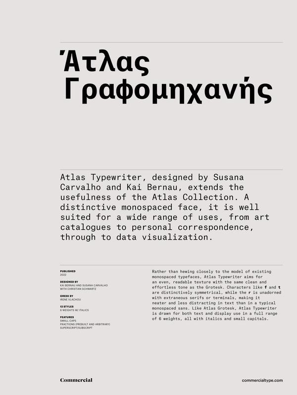 Atlas was originally designed as a corporate typeface for Munich Re, one of the world’s largest reinsurance companies. This typeface deliberately avoided contemporary trends in corporate type design in favor of the clear, optimistic tone of Dutch Modernism. The client produces hundreds of publications, reports, and other documents each year. They required a new typeface capable of maintaining clarity in often complicated typographical situations with a suitably well-considered range of weights. The new typeface also had to be economic in setting, saving space over the previous corporate face and saving significant amounts of paper in the process.