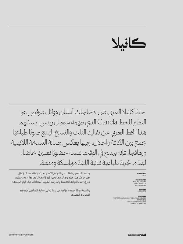 Canela Arabic, drawn by Khajag Apelian and Wael Morcos, expands the crisp elegance of Miguel Reyes’s Canela by drawing inspiration from both the Thuluth and Naskh traditions. While reflecting the sobriety and refinement of its Latin counterpart, it has a distinct and expressive presence of its own.
