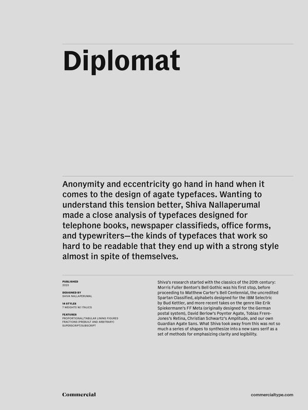 Delegate is a hardworking sans serif that celebrates Shiva Nallaperumal’s love of Bell Gothic and other anonymous, highly functional grotesques that manage to be invisible despite being made of idiosyncratic shapes. Truncated terminals keep apertures open; angled ascenders differentiate I from l without adding serifs; stroke contrast keeps counterforms open; and eccentric figures clearly differentiate 3 from 8, 6, and 9. This adds up to a typeface with functionalism as both a purpose and an aesthetic.