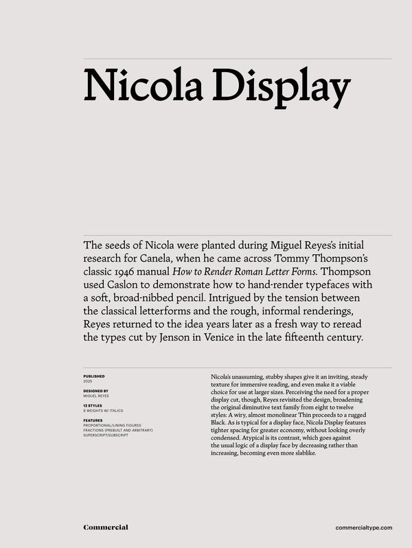 Before digital typesetting let designers set their own type, “comping”— hand-rendering headlines in various typefaces for copyfit and client approval— was an important skill. Miguel Reyes came across Tommy Thompson’s classic 1946 manual How to Render Roman Letter Forms and was struck by his renditions of Caslon, written quickly with a broad-tipped pencil. Thompson modulated the stroke weight by rotating the nib of the pencil, creating unusual serifs with interlocking, angled endings. Reyes thought that the tension between the rough, informal quality of the rendering and the classical letterforms would be a fresh way to interpret the types cut by Nicolas Jenson in Venice in the late fifteenth century. Elegant and brash, Nicola is a robust, low-contrast typeface whose simplified details verge on making it a slab serif.