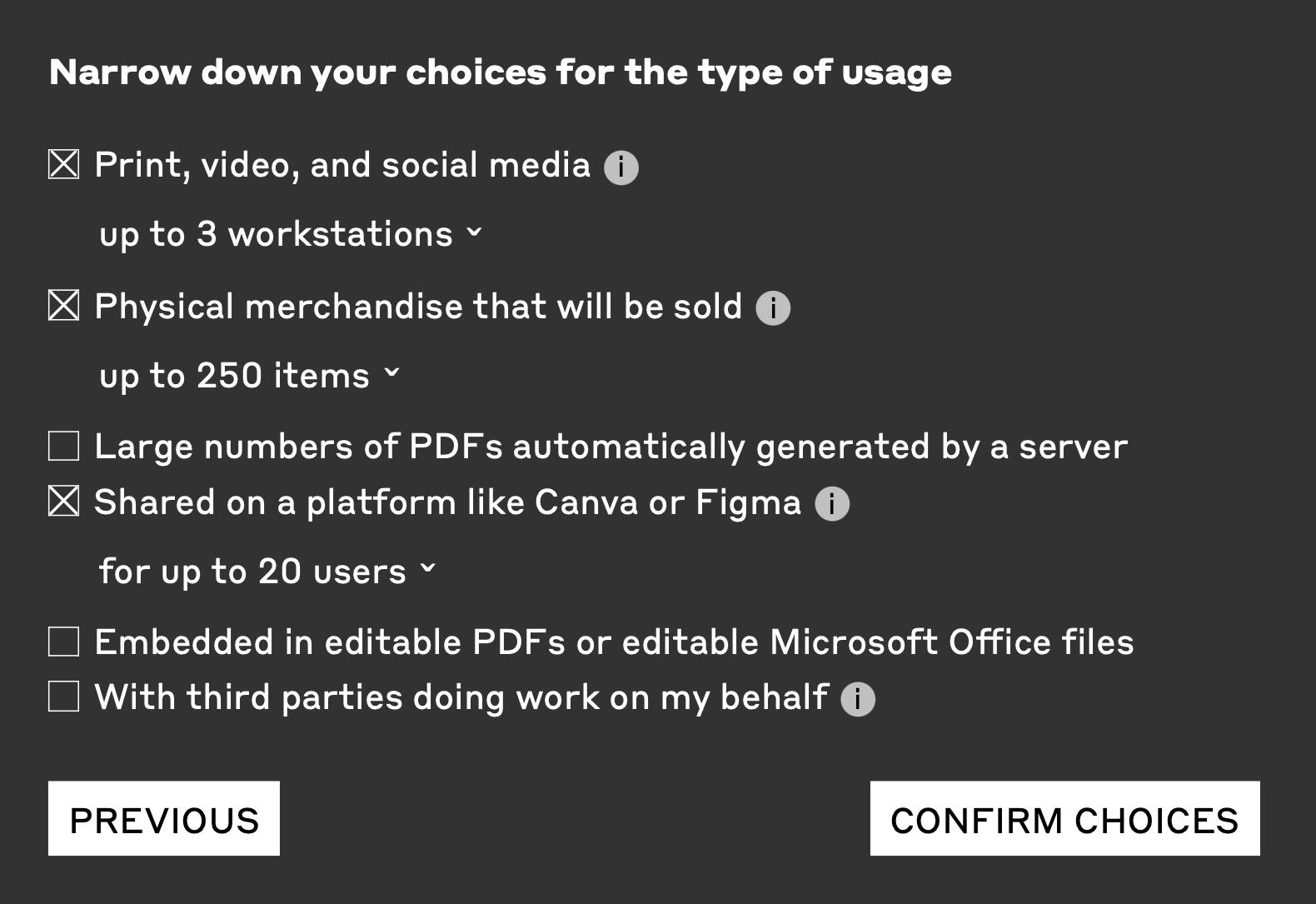Although we encourage you to read our EULA carefully, we also understand that you might be short on time and bandwidth. So we turned to our friends at GrayBits, the design and development studio that has shepherded our website through many iterations over the years. They took our fuzzy, complicated concept and ran with it, integrating an intuitive, user-friendly licensing wizard directly into the checkout experience. If you’re a seasoned art director who has already licensed a million fonts, you can probably do without much guidance; “I know which licenses I need” is selected by default. But maybe you’re not quite sure what you need. In that case, check “Guided licensing.” You’ll be walked through a series of questions that will help you narrow down the exact licensing scenario most appropriate for you. We think we’ve covered all the bases, but if you find that you still have questions, reach out. We’re happy to help.