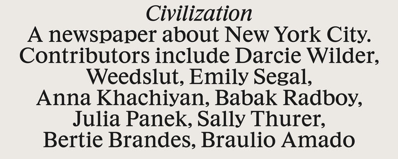 Since launching in 2018, Richard Turley and Lucas Mascatello’s cult newspaper Civilization had been using the macOS system version of Times. For Issue 7, released in September, Thomas drew a revival of a 4¼pt Times New Roman—working name: Civ—including cuts with slightly longer extenders. The paper’s designers have been using it at every imaginable size.
